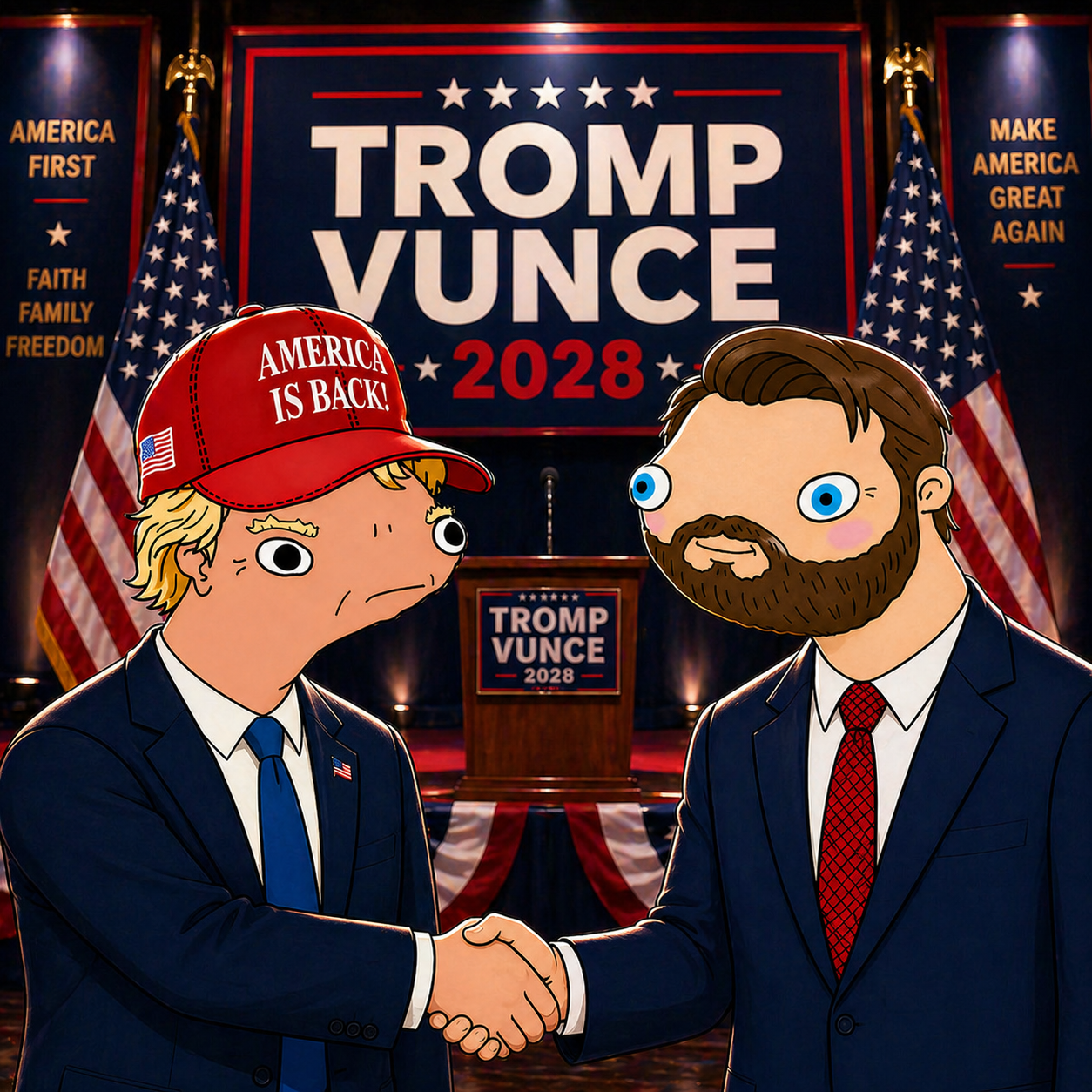 Yo MAGA Bruz! Duland Tromp, the God Emperor himself, and his ultra based VP JD Vunce are leading the charge! Draining the swamp, building the wall yuge, owning the libs daily. High energy rallies, tremendous wins ahead, covfefe vibes and fake news tears everywhere. No low T energy here - pure patriot fire! Deep state in full meltdown as we Make America Great Again bigly.